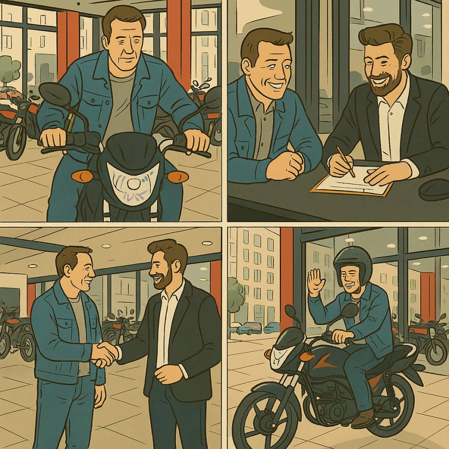 “sir we have only one Xtreme 250 for test-drive and one customer dropped the bike on Sunday. He dropped it not once but twice within the 100 meters of road where test drive is allowed. Sir, the gear is bent, the handle is bent, among other things, so the bike can’t be given for any test drive today.”
